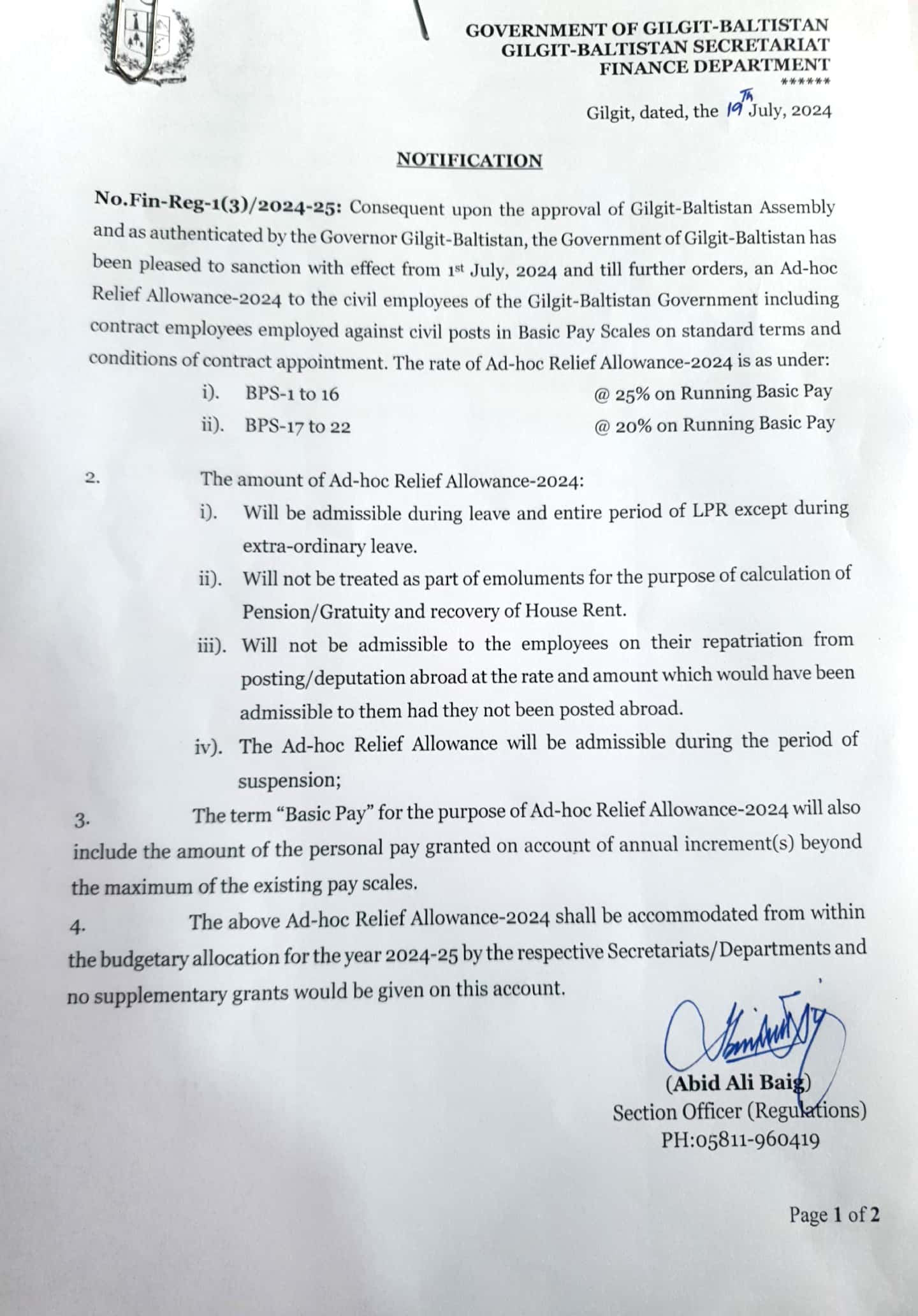 Notification of Ad-hoc Relief Allowance 2024 - Government of Gilgit-Baltistan