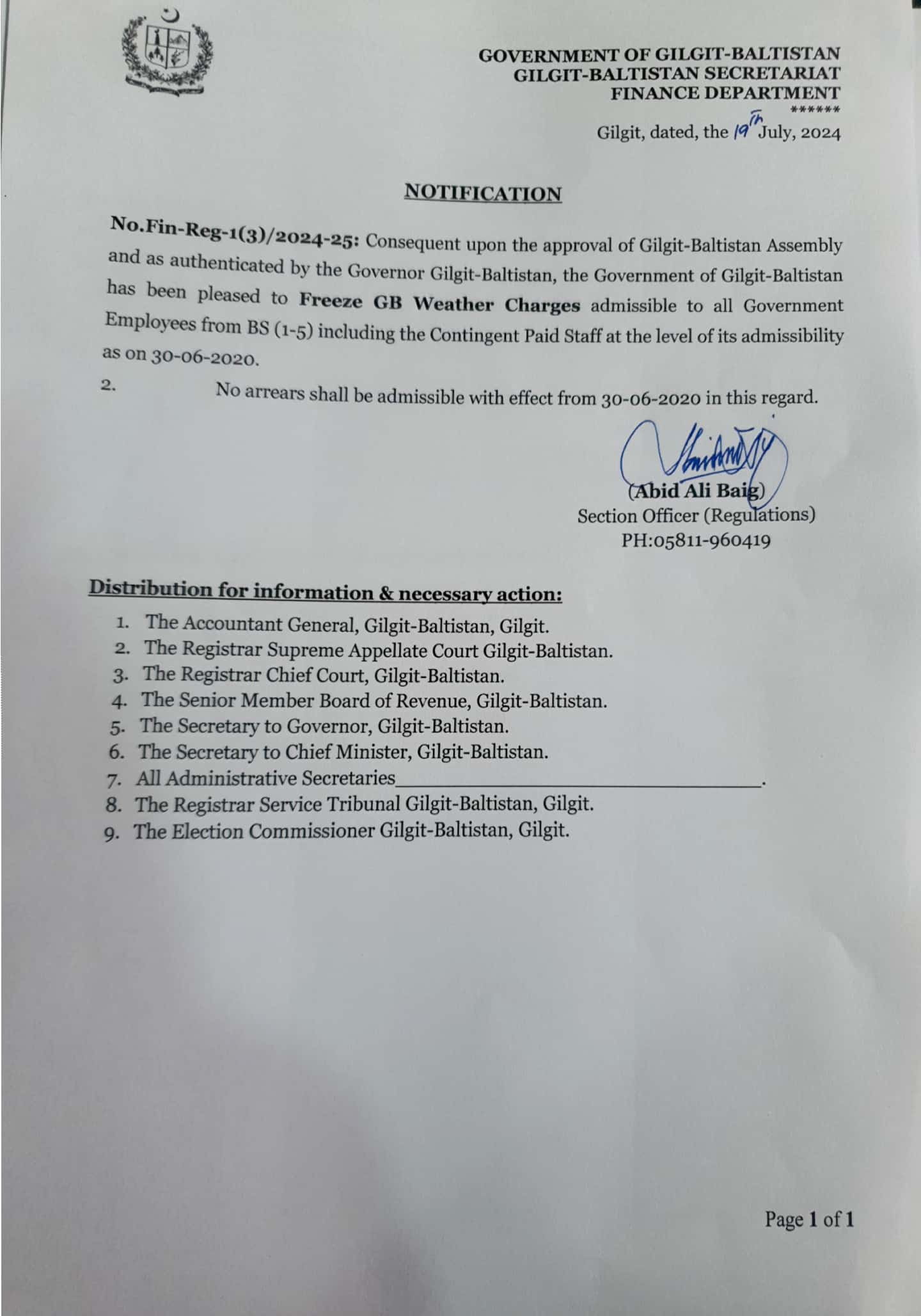 Freezing of GB Weather Charges 2024 - Government of Gilgit-Baltistan