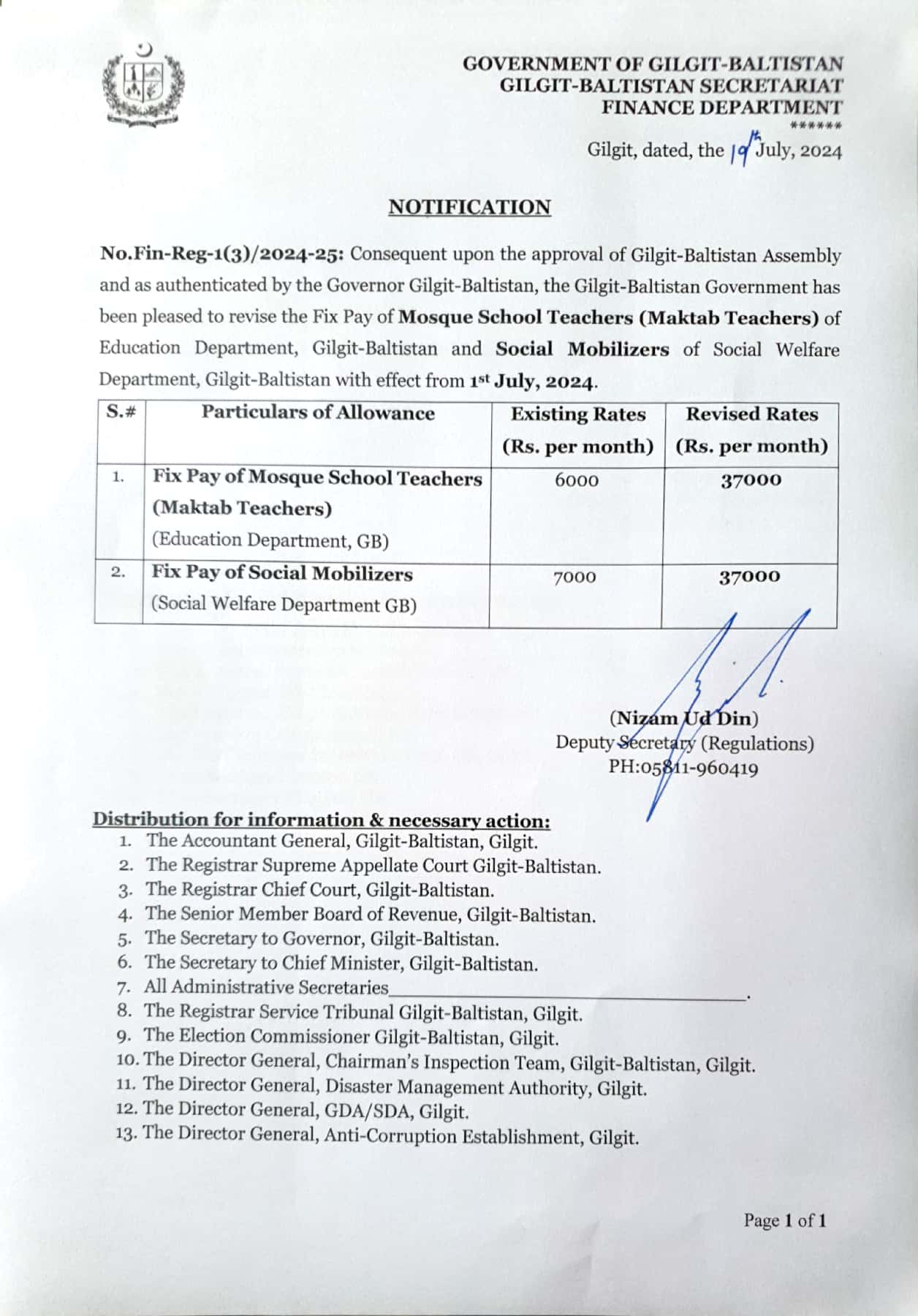 Notification of Revised Fix Pay for Mosque School Teachers & Social Mobilizers – 2024