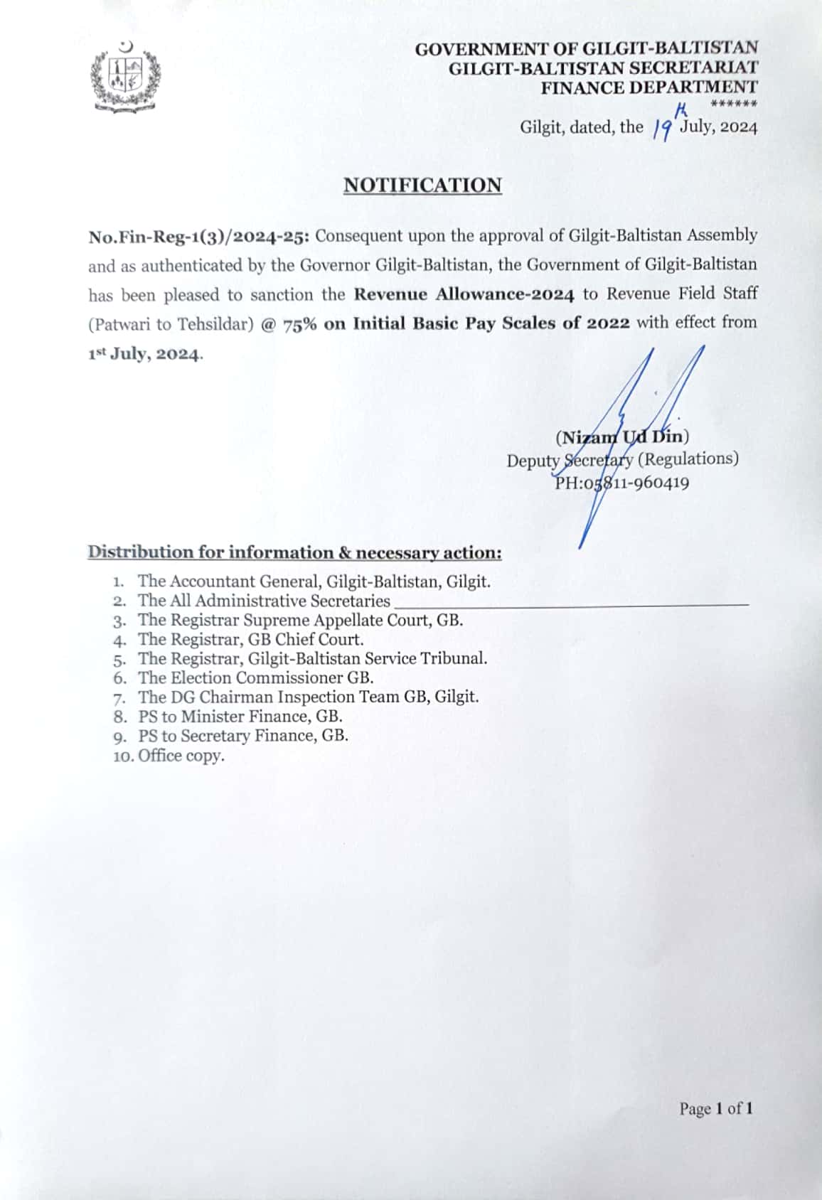Notification of Revenue Allowance to GB revenue field staff 2024 - Government of Gilgit-Baltistan