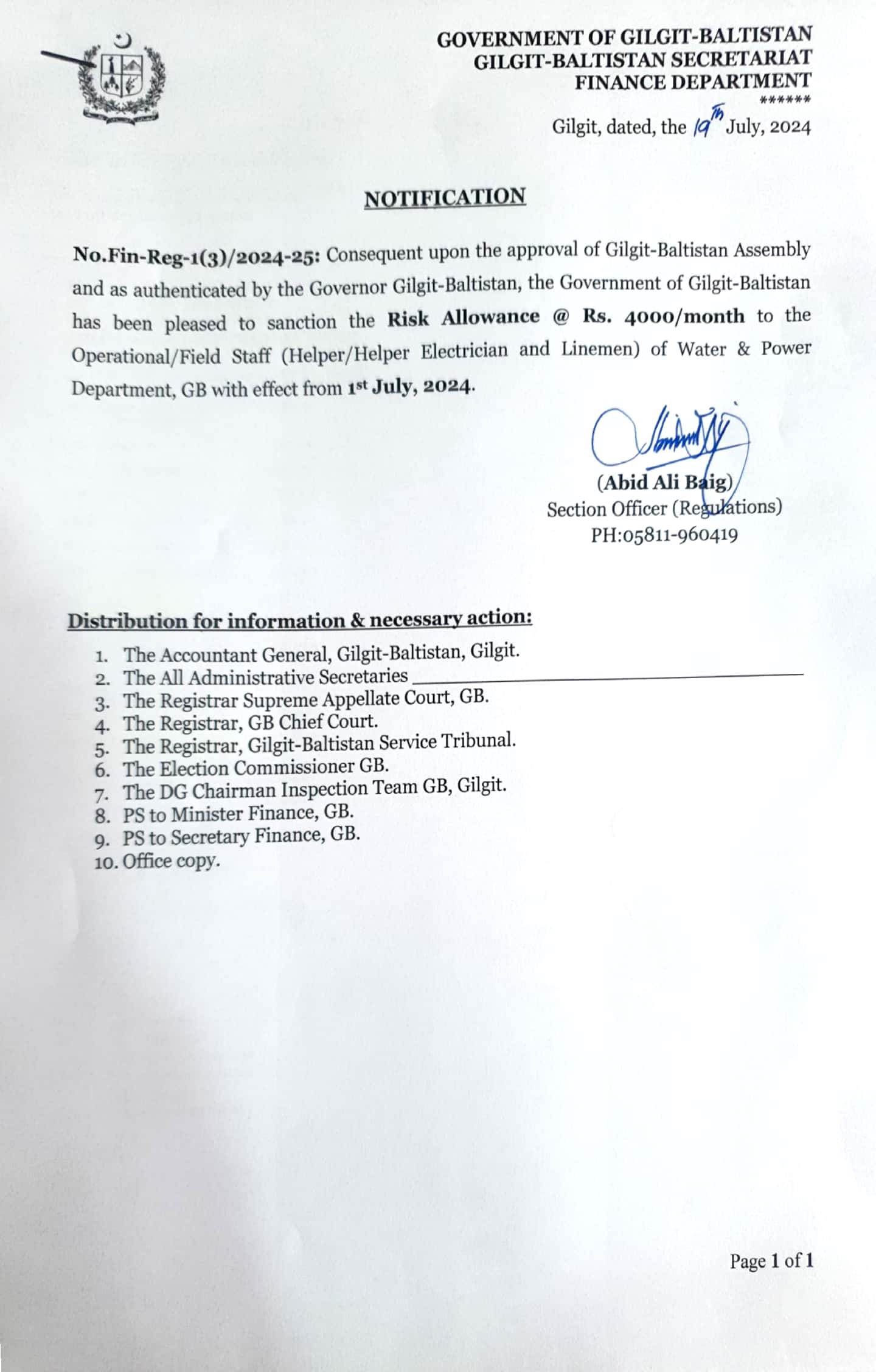| 18 | Notification of Risk Allowance to GB Revenue operational staff of Water & power department 2024 - Government of Gilgit-Baltistan | Download |